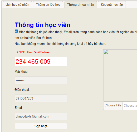 Cập nhật số ID NPD_HocRevitOnline lên trang hocRevit.vn tại trang điểm danh: