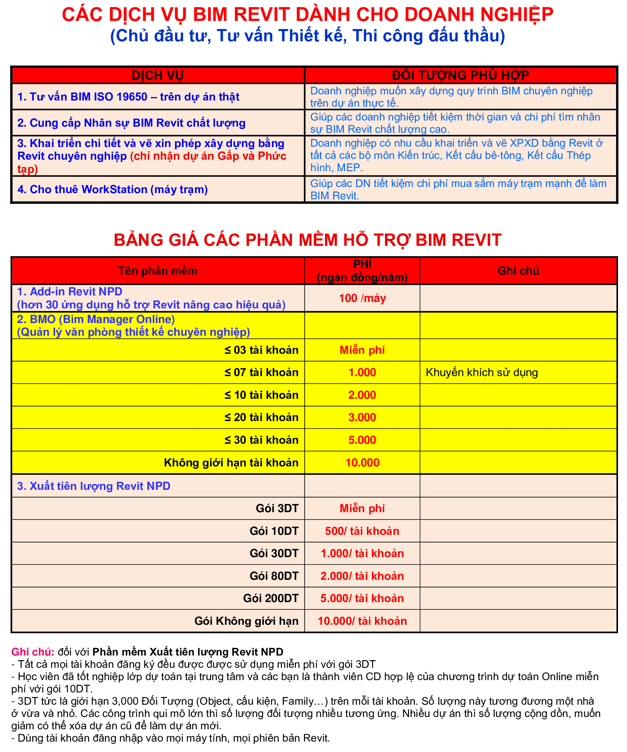 - Ngoài ra: doanh nghiệp được tặng các công cụ quản lý chất lượng, có giá trị cao như phần mềm "Quản lý thiết kế NPD" (giúp quản lý tiến độ và chất lượng thiết kế), phần mềm "Tiên lượng NPD" (giúp xuất khối lượng chi tiết từ Revit sang Dự toán) v.v...